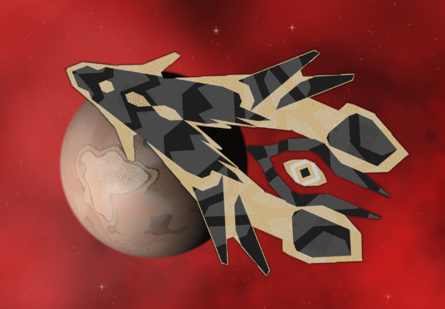 What the fleet saw was a mass of darkness,a patch of black amidst the stars,as if the stars were not even there. A single "ship" manifested itself from the portal. It was a 700 meter long magnaspawn,comprised mostly of crystals that emit a golden glow,with some dark,shiny Nullfite acting as armor against physical weapons. It's shape somewhat resembled a dagge,with protrusions coming out of it's sides.