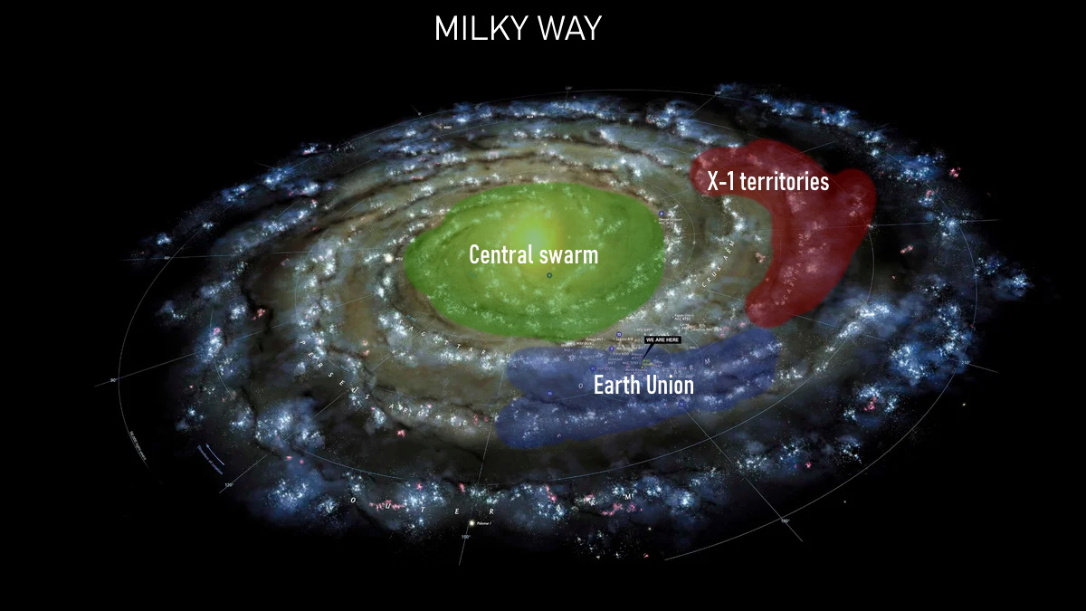 Next to it are the Central Swarm and X-1 territories. The central swarm is a fleet unknown to anyone, consisting of a huge number of powerful frigates. Because of this, not a single earth's ship flew to the center of the galaxy. X-1 is the general name for territories that have taken over copies of an AI robot that escaped from its owner, a smuggler. The X-1s are trying to take over Earth in order to take revenge on humans for mistreating robots.